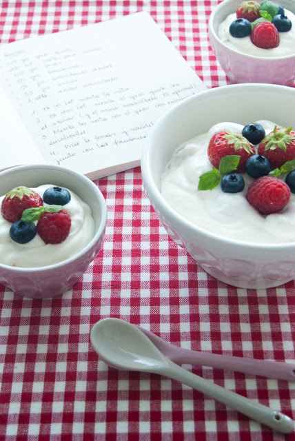 El postre de hoy es una mousse de quark que bien podría llamarse rahka, pero que cuando es de fresas se llama mansikkarahka, cuando es de arándanos mustikkarahka, cuando es de frambuesas vadelmarahka y cuando es de todo, como la de hoy, pues ya la hemos liado.