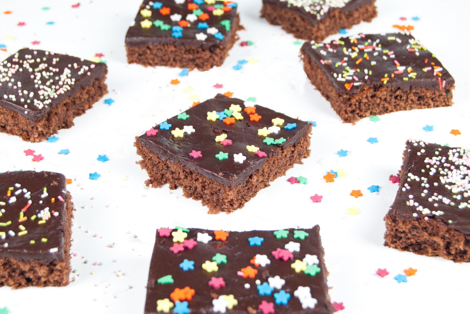 2. For the frosting, simply mix all the ingredientes (but the sprinkles) and spread it on the cool sponge cake (use a spatula, the frosting is quite thick). Decorate with sprinkles or nonpareils and cut the cake into squares to get the mokkapalat.