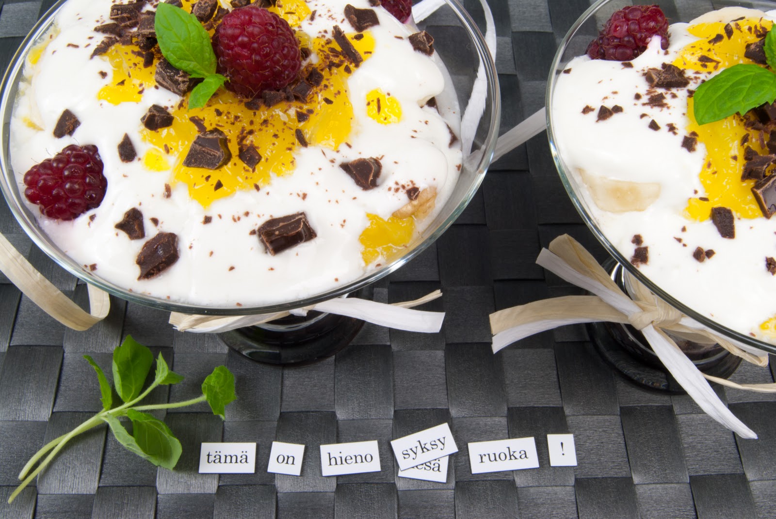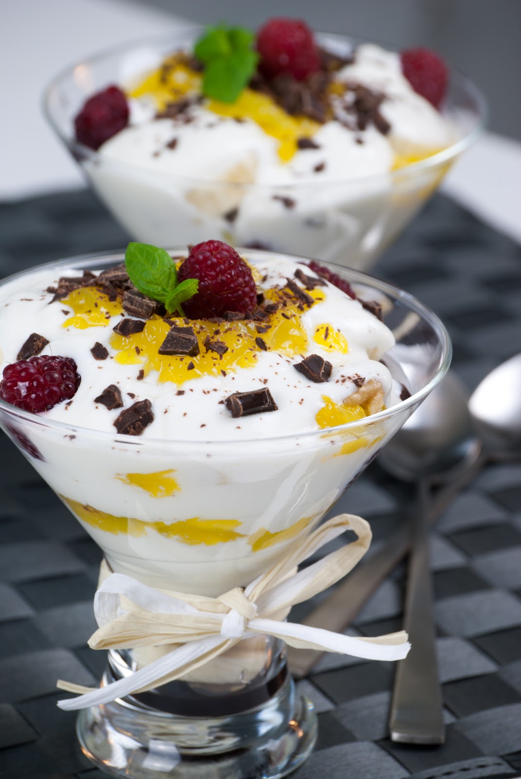 3. Prepare the parfaits in transparent glasses of parfait dishes. You can decorate them with a little chocolate syrup before adding the rest of the ingredients (optional). Alternate some layers of yogurt, fruit, walnuts, gelatin and chocolate. Finish with a yogurt layer decorated with more chocolate, couple raspberries, a little gelatin, some mint leaves…