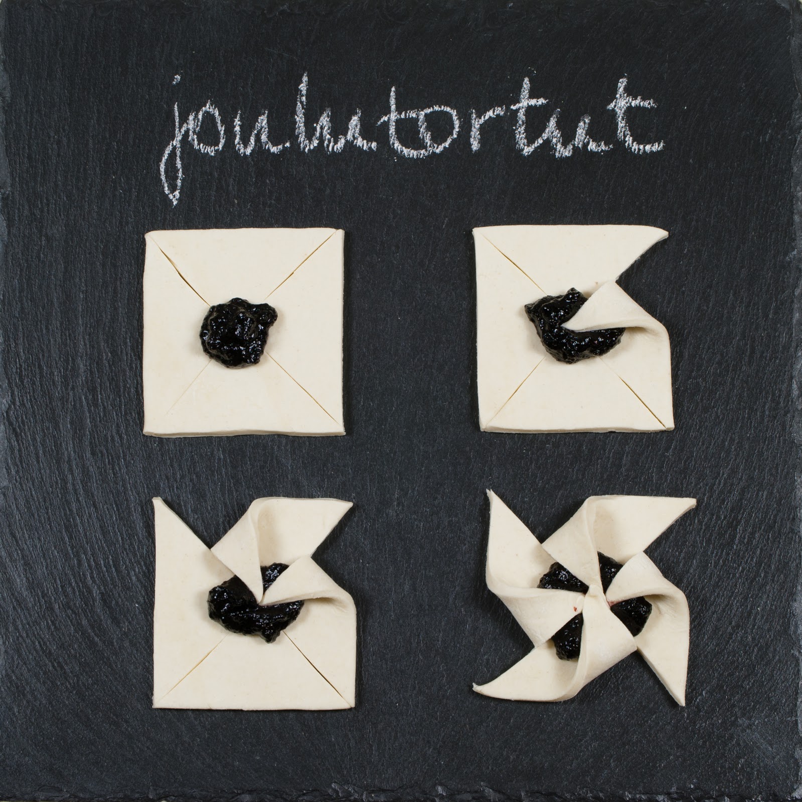 2. Cut the puff-pastry into 8 cm x 8 cm squares. Make cuts from the corners to inside, leaving the center intact. Place a spoon a jam on it. Fold the corners of the puff-pastry as you see in the picture. Press strongly to close them, so they don’t get open in the oven.