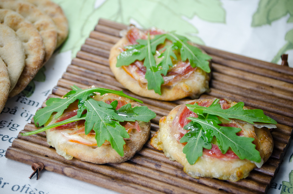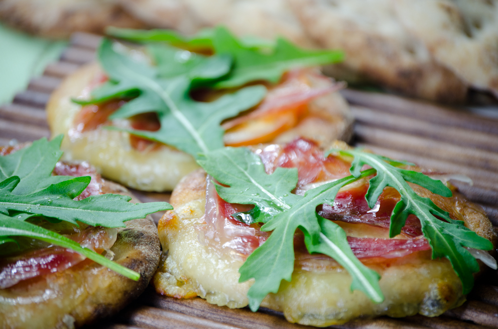3. Cuando estén listas, coloca unas lascas de jamón serrano y unas hojas de rúcula sobre cada rieska. Termina con unas gotas de aceite de oliva sobre la rúcula.