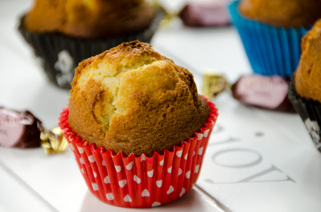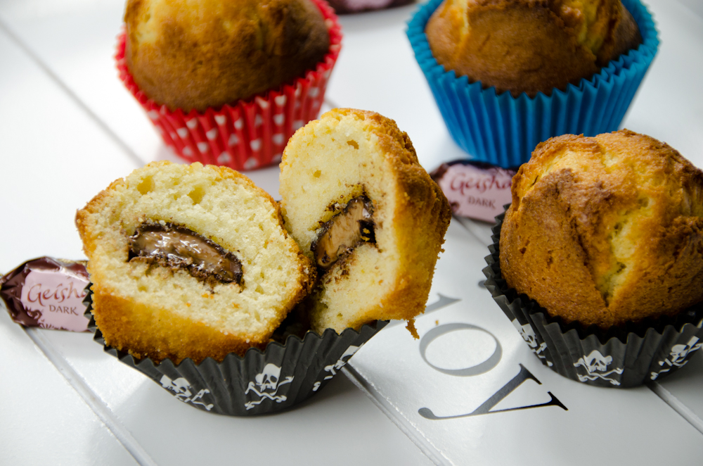 4. Beat the batter vigorously with a whisk. Fill the muffin cases using a piping bag (you can also do it with a spoon) until half of the capacity. Place a chocolate in the center of each magdalena and push it lightly down with your finger. Fill the cases until ¾ of the capacity, taking care that the chocolates are totally covered by batter.