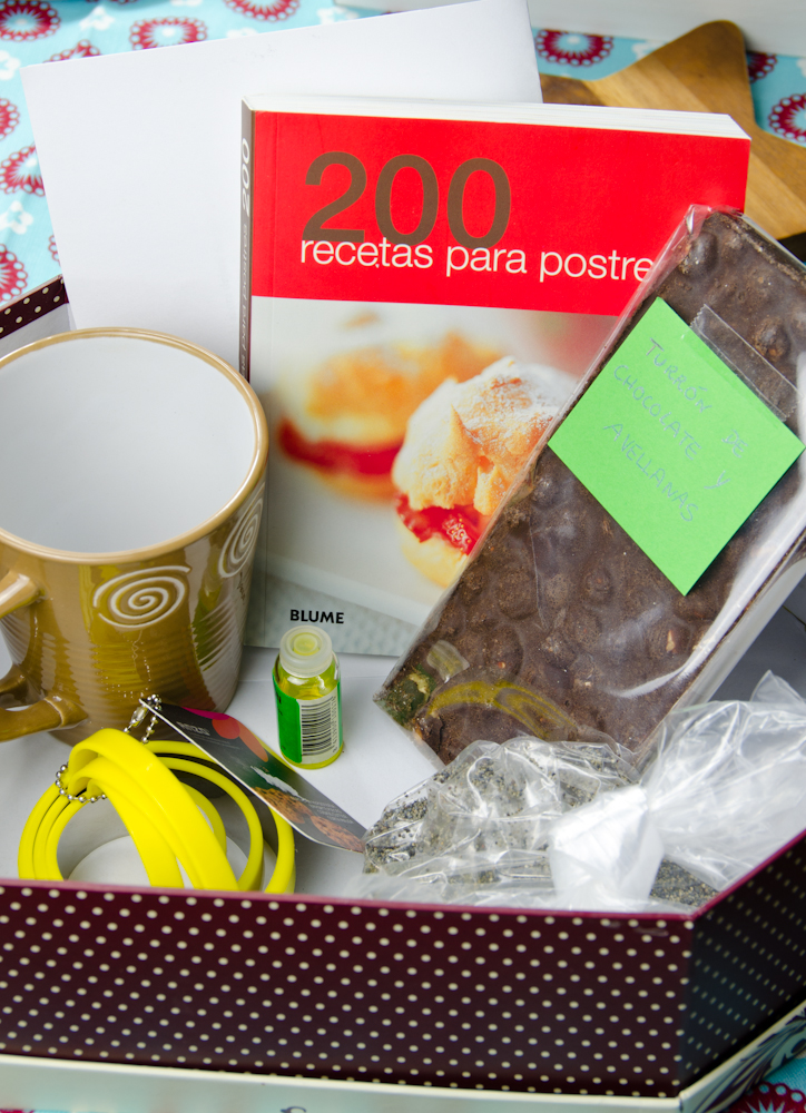 En una caja muy chula me encontré con un libro de postres (luego ella me comentó que era una especie de tradición y que siempre regalaba ese libro a sus AIG), una taza con una cuchara (que la pobre llegó en tres pedazos, así que volví a montar el hospital de campaña y ya se está recuperando), un turrón de chocolate con avellanas hecho por ella (el regalo que más me ha gustado, ¡está impresionante! se nota que le puso cariño), unos cortapastas redondos, semillas de amapola, perlitas de azúcar y esencia de limón. Muchísimas gracias por todo Judith, me ha encantado que seas mi primera AIG (¡que no la última!).