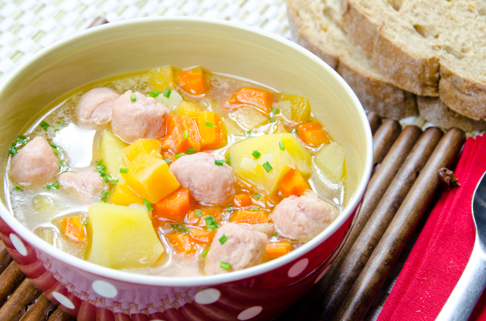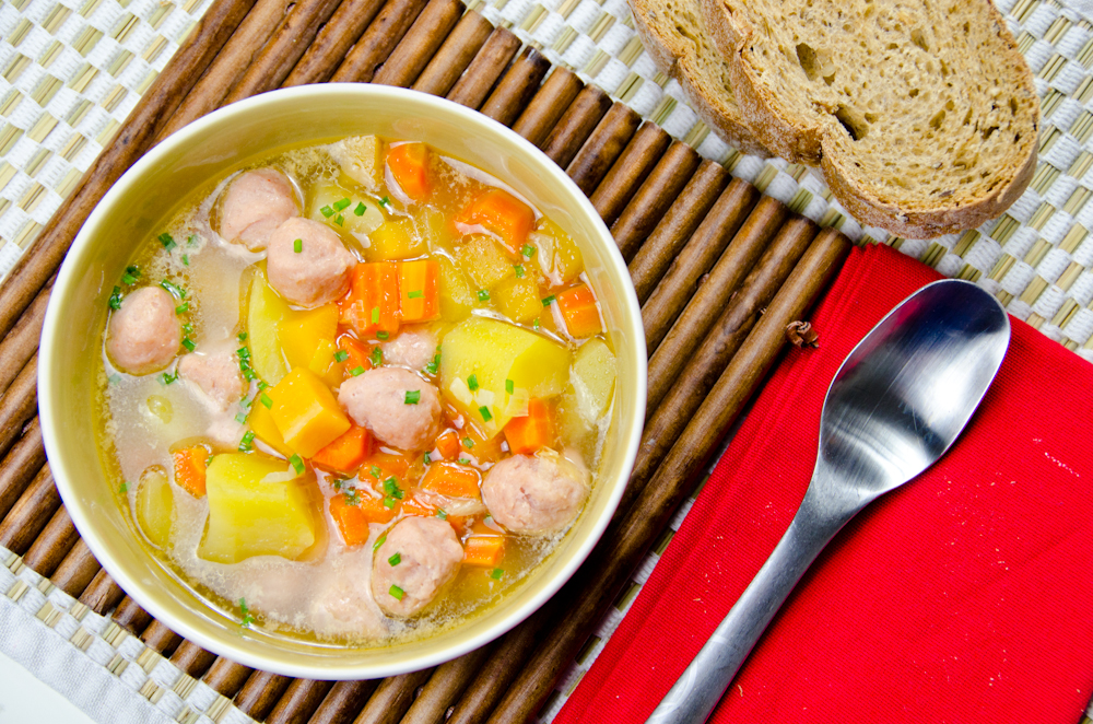 2. When the potatoes are almost ready, add the sausages. The traditional way is squeezing the casing and letting the sausage pieces drop into the soup, where they’ll get a ball shape. Let the soup cook for 15 minutes more and serve with some chopped parsley or chives.