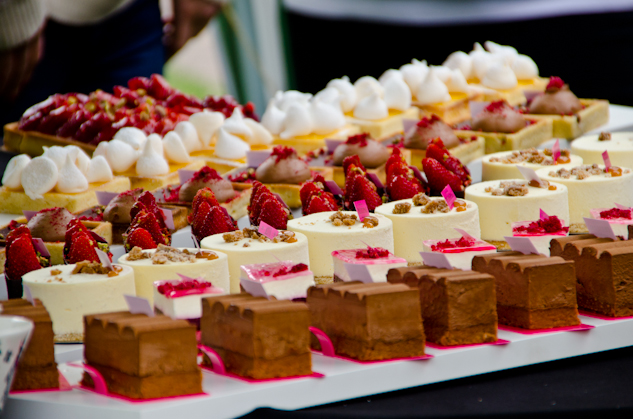 Cuando ya nos íbamos descubrimos un puesto que nos llamó mucho la atención, ofrecían pasteles de un acabado claramente profesional y de pronto un rostro que nos resultó familiar… El pastelero Julien Petitpas estaba allí cargando con sus creaciones y no pudimos sino sucumbir a la tentación.