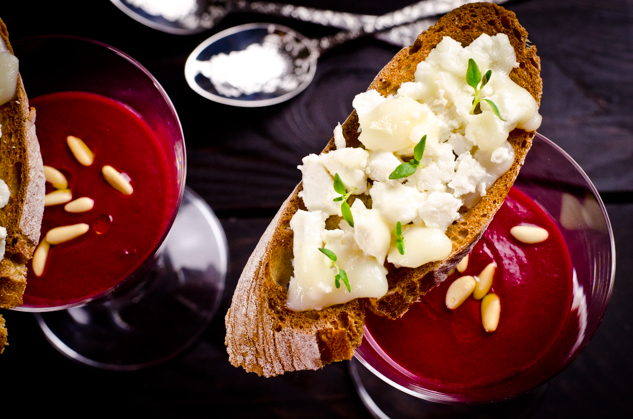 Beetroot and raspberry vinegar soup with cheese and thyme tosta