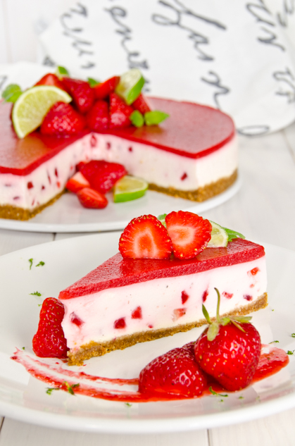 3. Keep the gelatine leaves in cold water for some minutes. Whip the cream with a pinch of vanilla bourbon using an electric whisk, until stiff peaks. In another bowl, mix the quark with the sugar and 3 tablespoons of lime juice (you can use the same electric whisk for this purpose). Wring out the gelatine leaves and heat them with the rest of the lime juice in a small pot. When the gelatine is dissolved, pour the lime juice mix little by little into the quark and mix it quickly with a whisk. Add the strawberry dices and the whipped cream and mix gently with a spatula. Pour this mixture over the cookie base and keep the cake in the fridge for 3-4 hours.