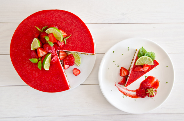 5. Repasa con un cuchillo de punta roma todo el diámetro de la tarta, para desmoldarla con facilidad. Desmolda y decora a tu gusto con fresas, rodajas de lima y hojas de menta o melisa.